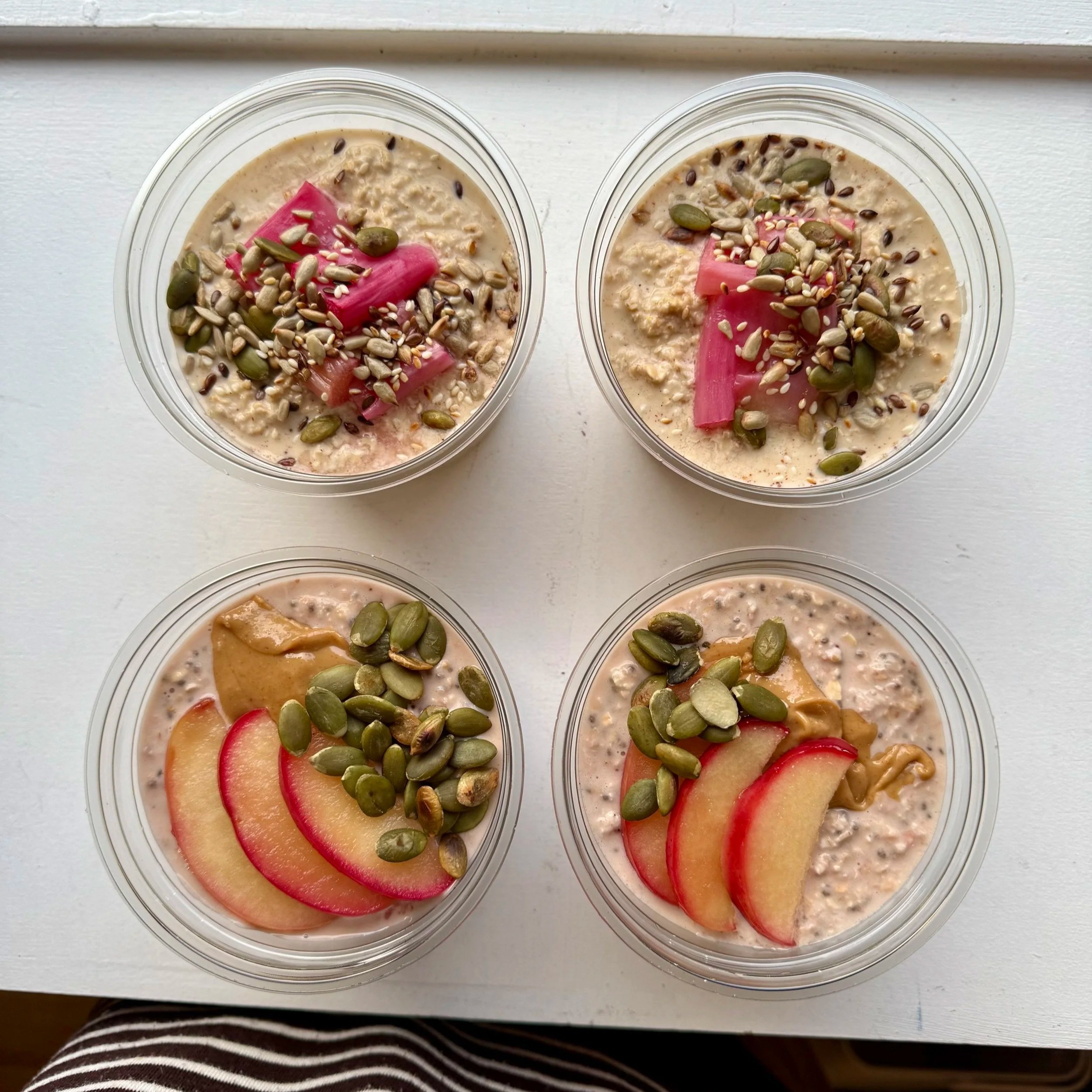 A creamy, strawberry-laced oat & chia base, topped with baked apple and smooth peanut butter, finished with toasted pumpkin seeds.
