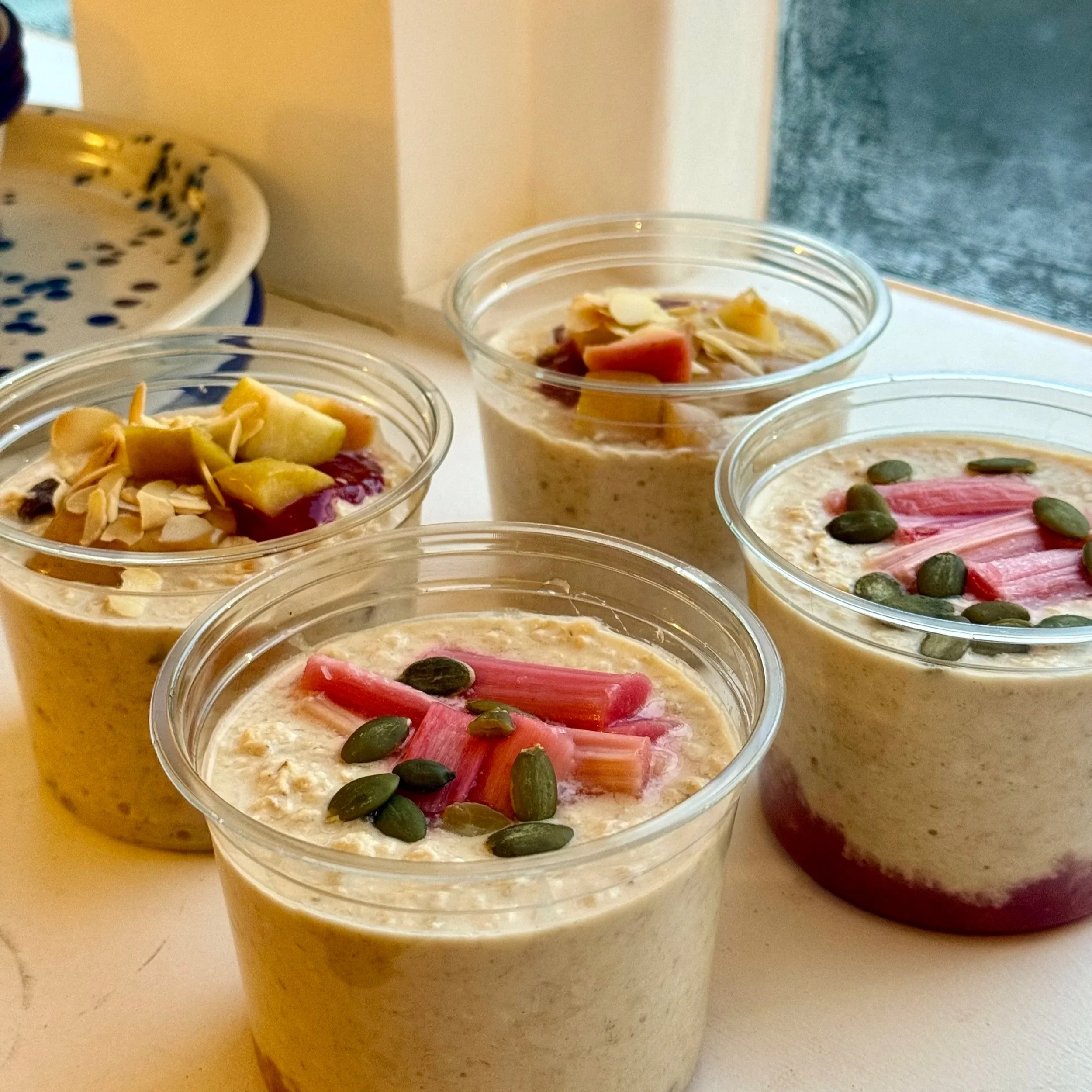 A blend of chia, oats and grated apple soaked in oat milk and vanilla extract. Sweetened with maple syrup and topped with slow cooked Yorkshire rhubarb, then sprinkled with toasted almonds and desiccated coconut.